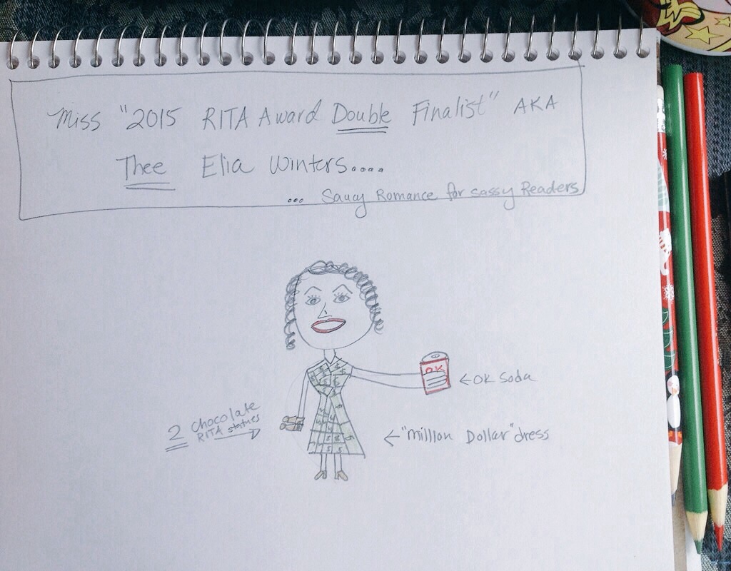 Elia Winters was nominated for not one, but two Rita awards. I brought her book Purely Professional with me to Vegas, as if 109 degrees wasn’t hot enough. (I’d write more, but this is a family-friendly blog.) When Elia saw my drawing, she Tweeted me a GIF of Will Ferrill in a box of emotion from Anchorman. I think I may have peed my pants.